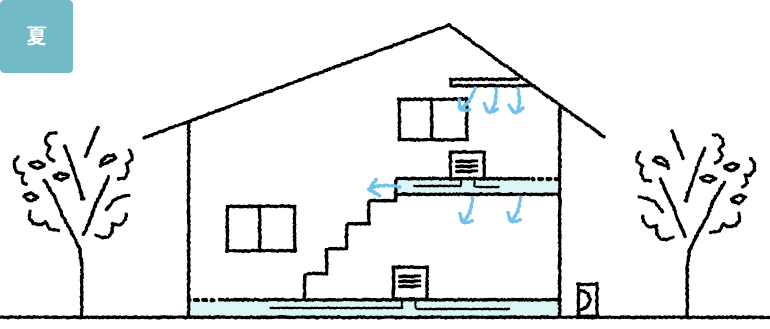 室内機により集められた空気は、ヒートポンプ方式で効率よく冷やされ、床下チャンバボックスへと送り込まれます。床下チャンバボックスに送り込まれた冷風は、床下ダクトを通り床下に放出され、床下空間と床面全体を同時に冷やします。床下の空気が空気チャンバを通じて天井から吹出され、家全体をやさしく冷やします。