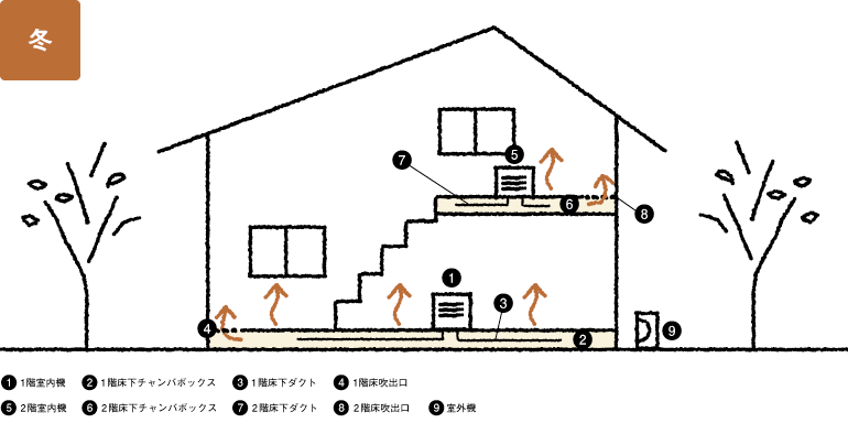 室内機により集められた空気は、ヒートポンプ方式で効率よく暖められ、床下チャンバボックスへと送り込まれます。床下チャンバボックスに送り込まれた温風は、床下ダクトを通り床下に放出され、床下空間と床面全体を同時に暖めます。床全体を暖めた床下の空気が、各所に設けられた床吹出口より放出され、家全体を心地よく暖めます。