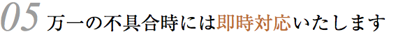万一の不具合時などは即日対応を基本としています。設計施工、一貫体制ならではの対応力でアフターメンテナンスもご満足いただいております。又、工事保険にも入っておりますので、もしもの時も安心です。