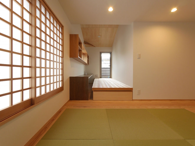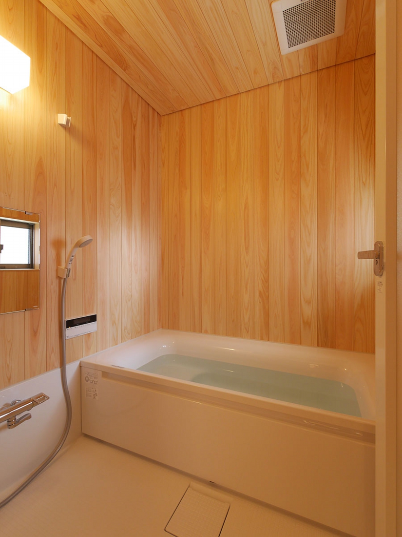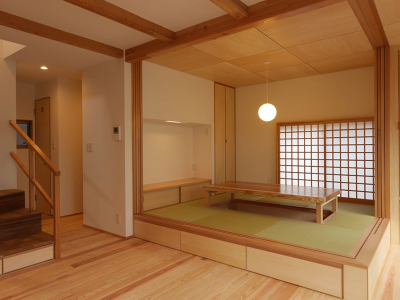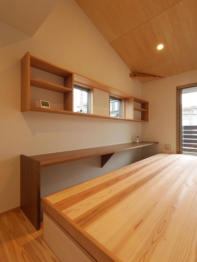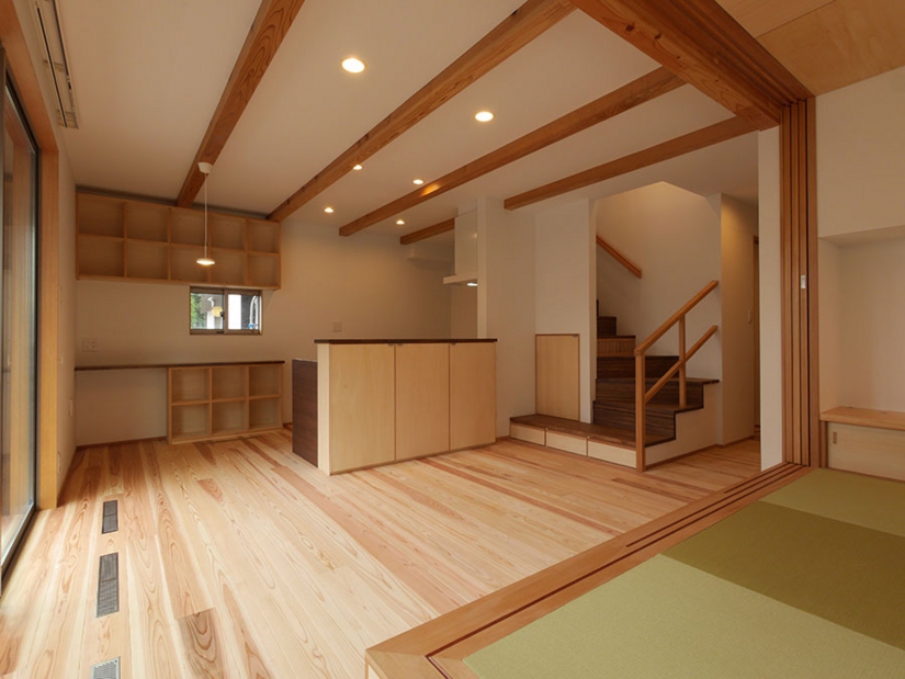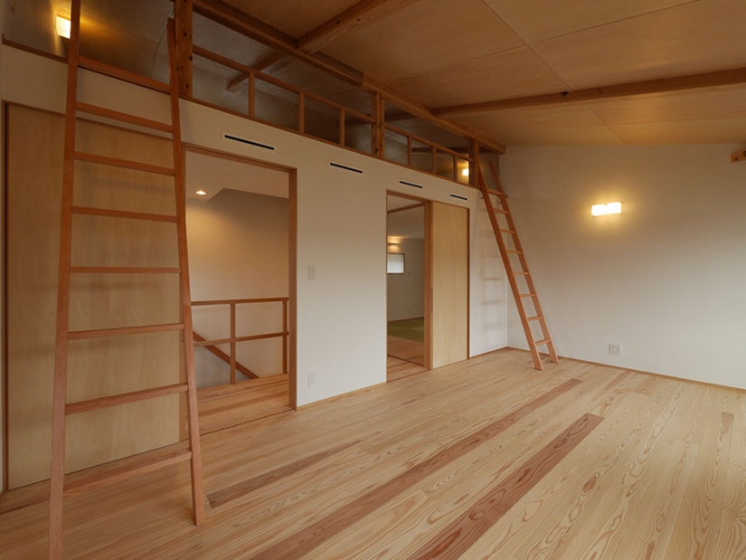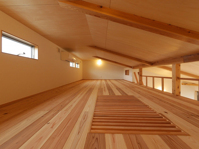 全体に自然素材を使用した、木の香りに包まれる心地よい住まい。小上がりの和室が印象的な1階は、各所に収納を設け、コンパクトながらすっきりとした見た目を保つ工夫をしています。2階は開放的な吹き抜け天井の子供部屋を中心に空間を広々とを使用しています。広さ、高さを最大限に利用したロフトは大容量の収納が可能なほか、床にガラリを設えることで風通しの良い空間としました。こちらの住まいには、床暖房「CCFシステム」を採用しており、床下から一年中心地よい空気を送り出して快適に過ごすことができます。
