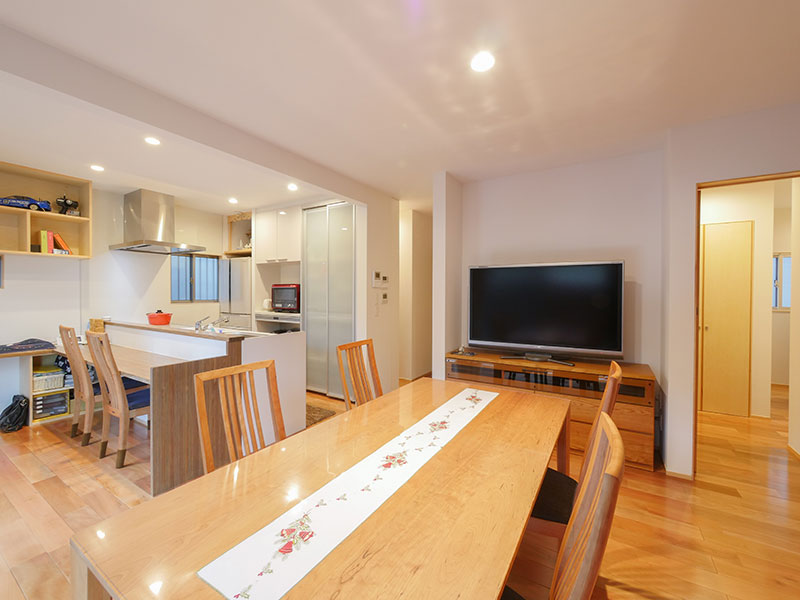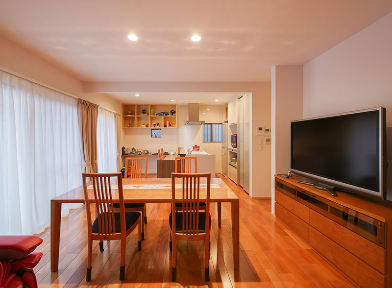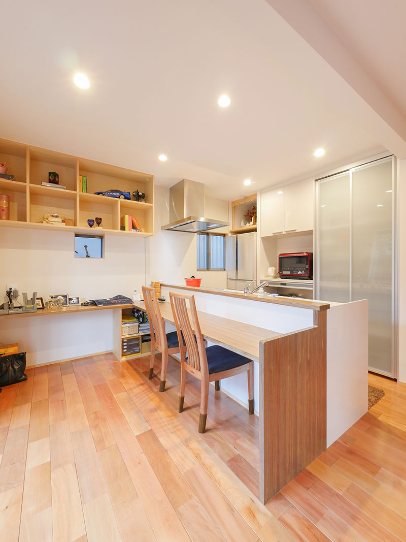 2世帯住宅として住まわれていた住まいを、老朽化を機にもっとコンパクトにされたいとご依頼いただきました。外観にはあまり手をかけず、内観の動線にこだわりました。玄関の大きなシューズボックスや、裏手に大容量の収納を設けるなどすっきりと暮らして頂くための工夫をしています。CCFの設置、耐震改修も行っており、性能面でもきちんと安心して暮らせる住まいとなりました。