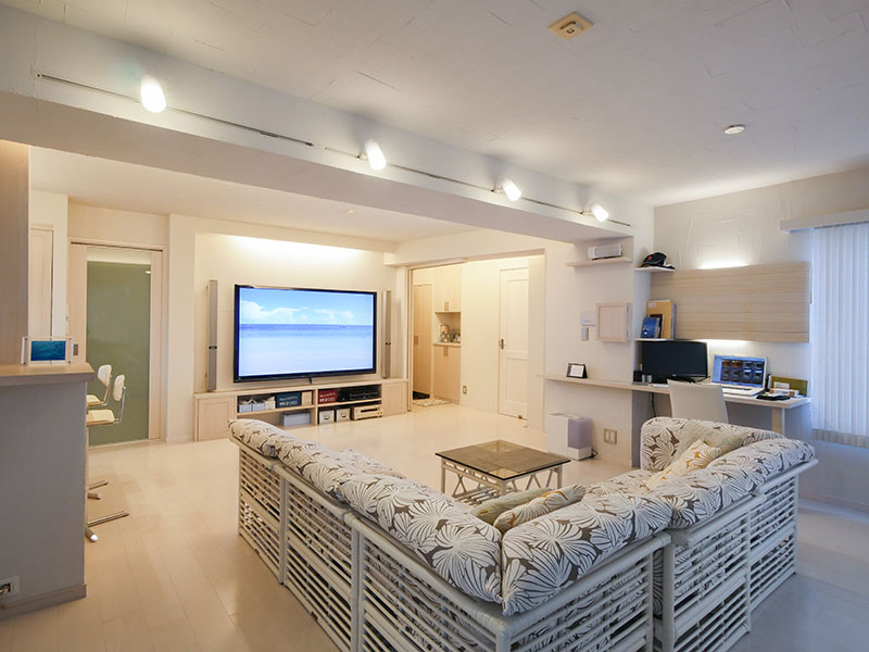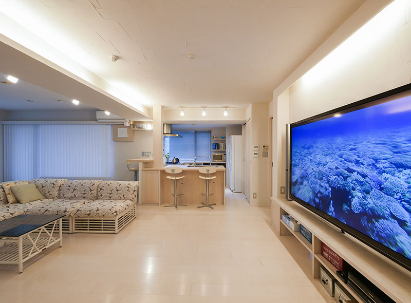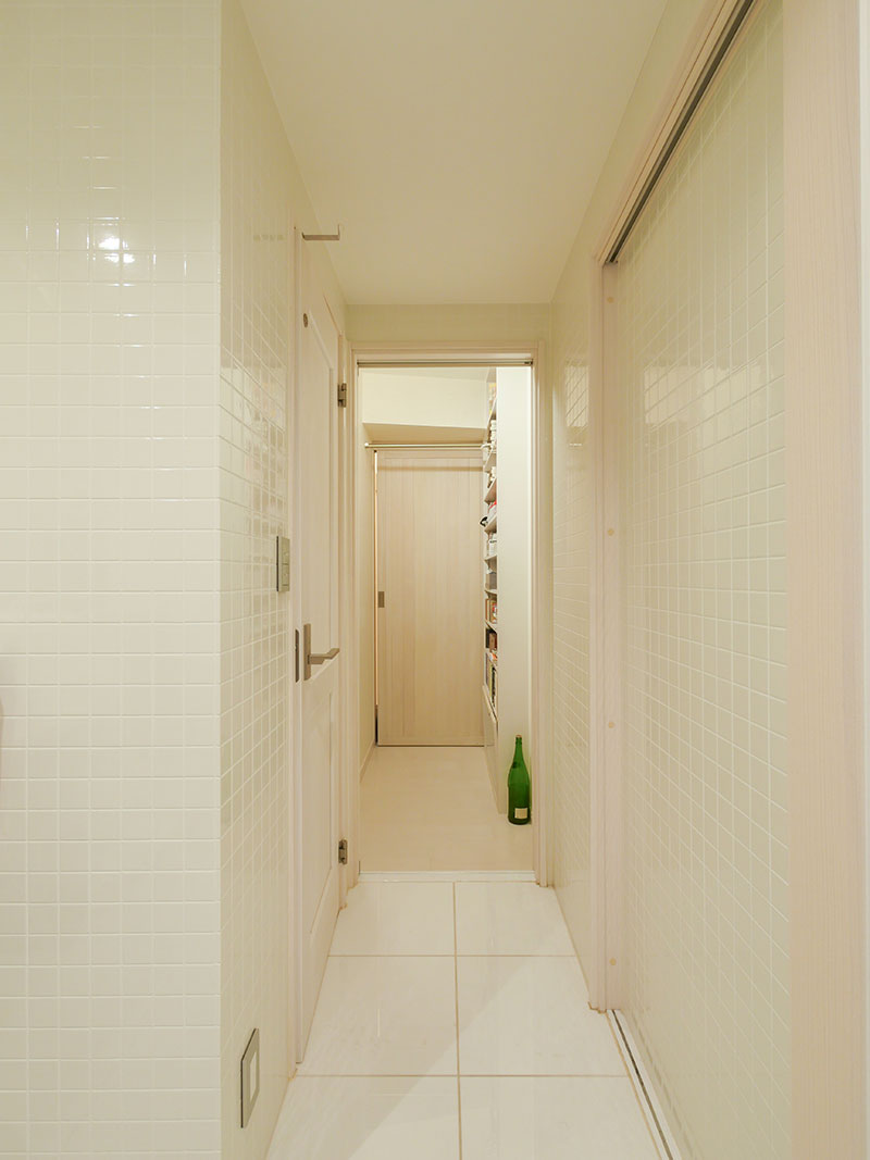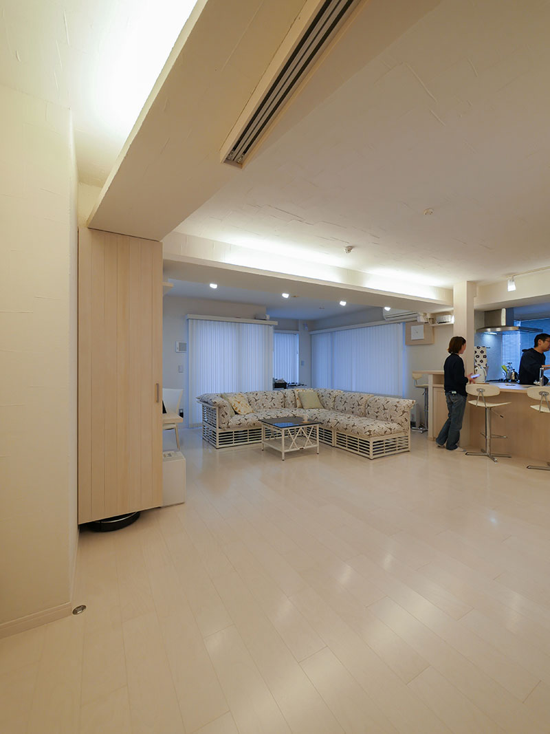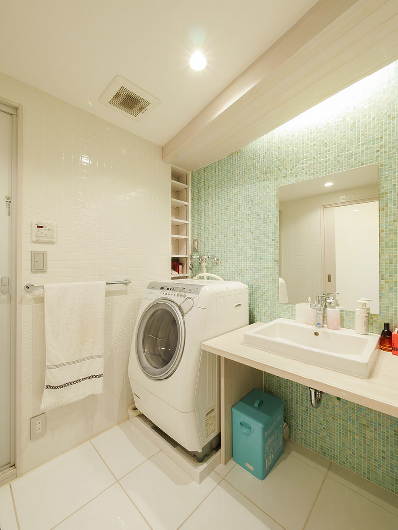 住んでいたマンションのペントハウスが空いたため、新居として購入されたMさん。その全面リフォームを竹駒工務店にお任せ頂きました。白を基調とした空間は無機質になりすぎないよう自然素材の珪藻土を使用し、手仕事の暖かみを添えています。中央にお風呂のある難解な間取りを、開放的なリビングダイニングを中心とした廻れる動線へと変化させました。洗面所に設えたグリーンのタイルも印象的な住まいです。