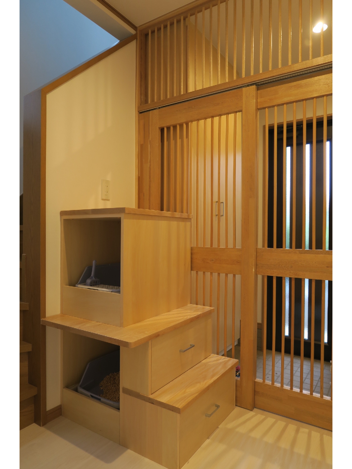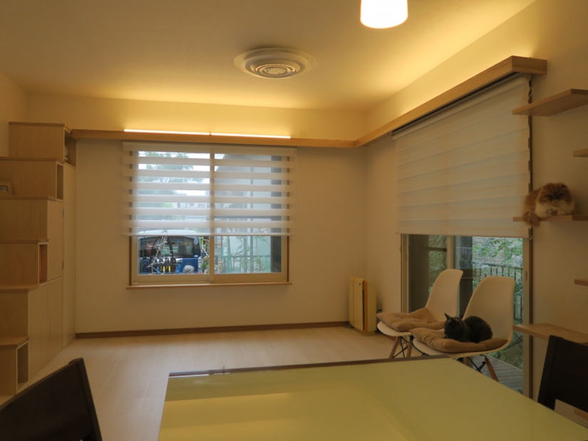 長期優良住宅化リフォームを用い補助金をうけたリフォームです。屋根・外壁の遮熱塗装・節水トイレ・高断熱浴槽・全既存窓に内窓を施工し性能面でも、安心して生活して頂ける住まいになりました。造り付け家具・棚はキャットウォークと連接し、お飼いになられている、猫ちゃんにも満足いただける仕様となりました。
