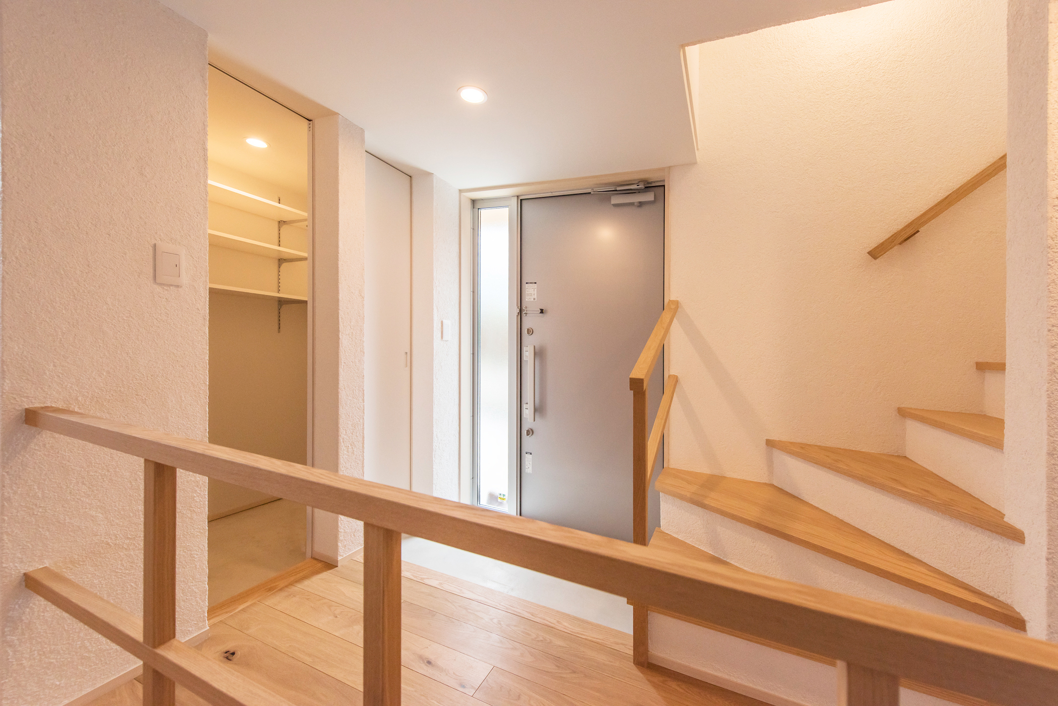 ・玄関からリビングへと間仕切壁を作らず開放的な空間にし、また、防音室も間仕切り上部をガラスにし閉鎖的にならないようにしました。